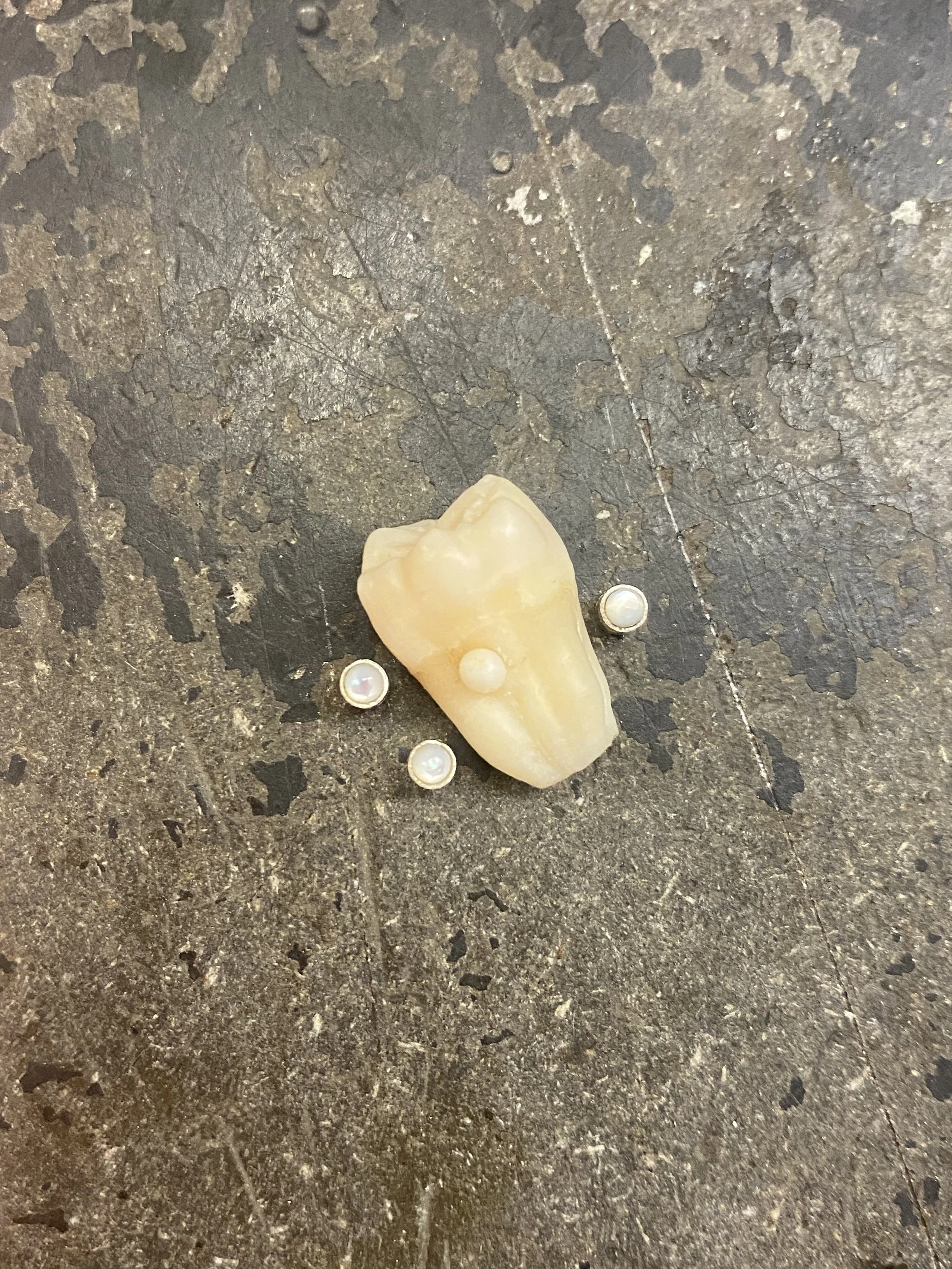 A Sprinkle of Wisdom | Sterling silver, copper, enamel, human tooth, mother of pearls | 20 x 37 mm | 2025
