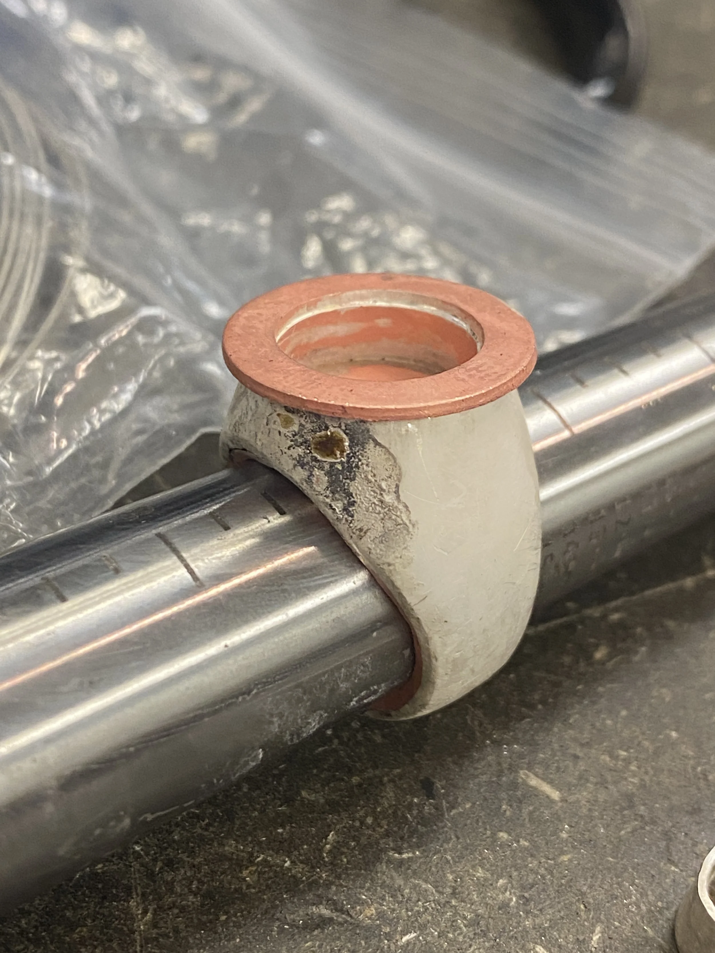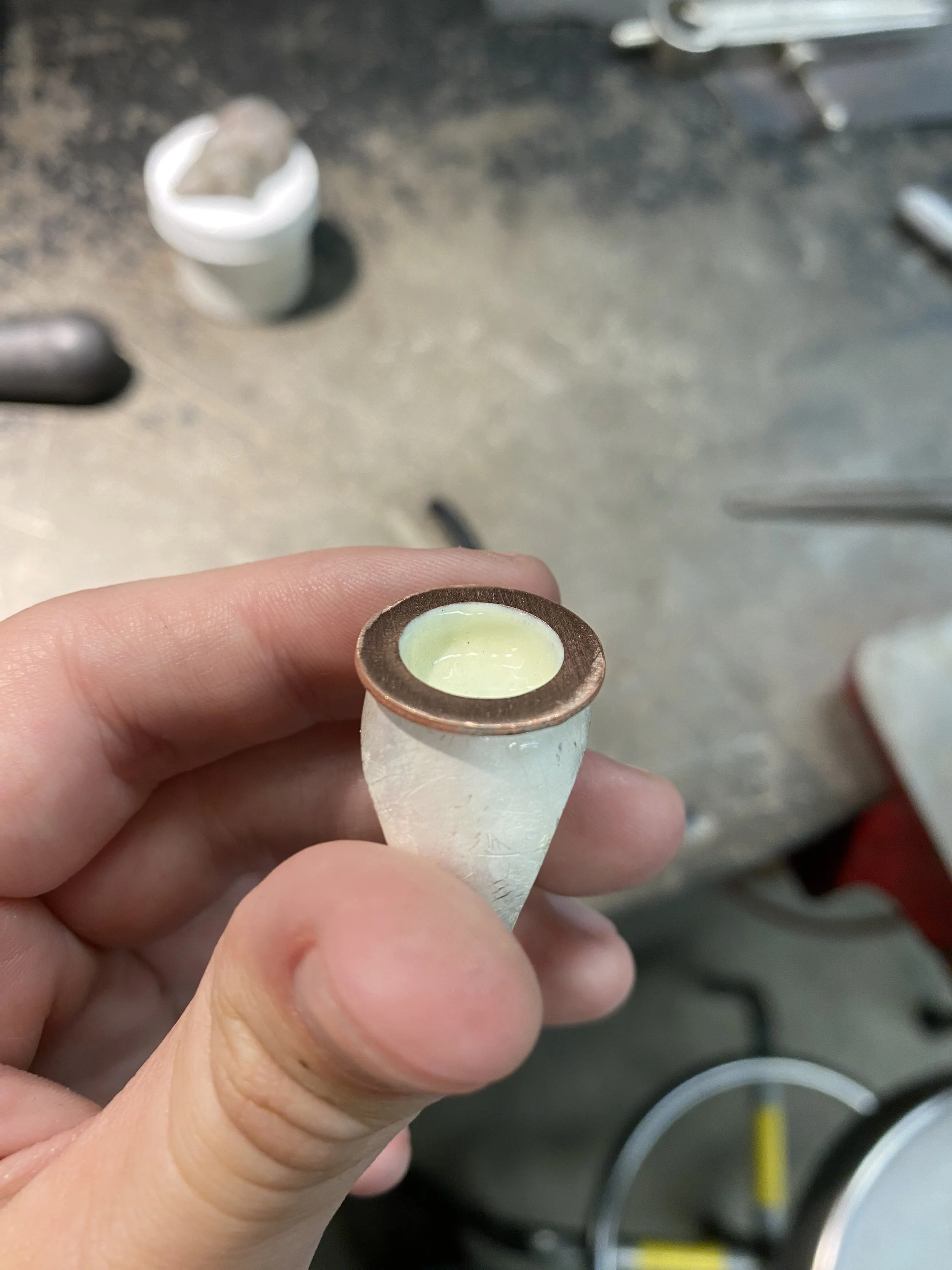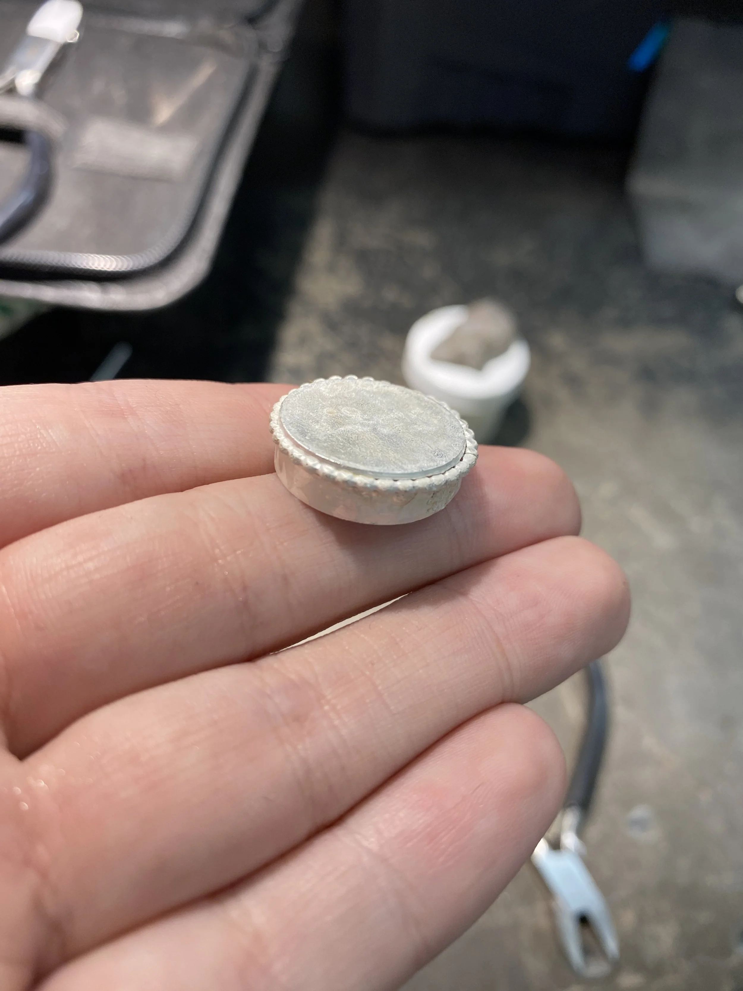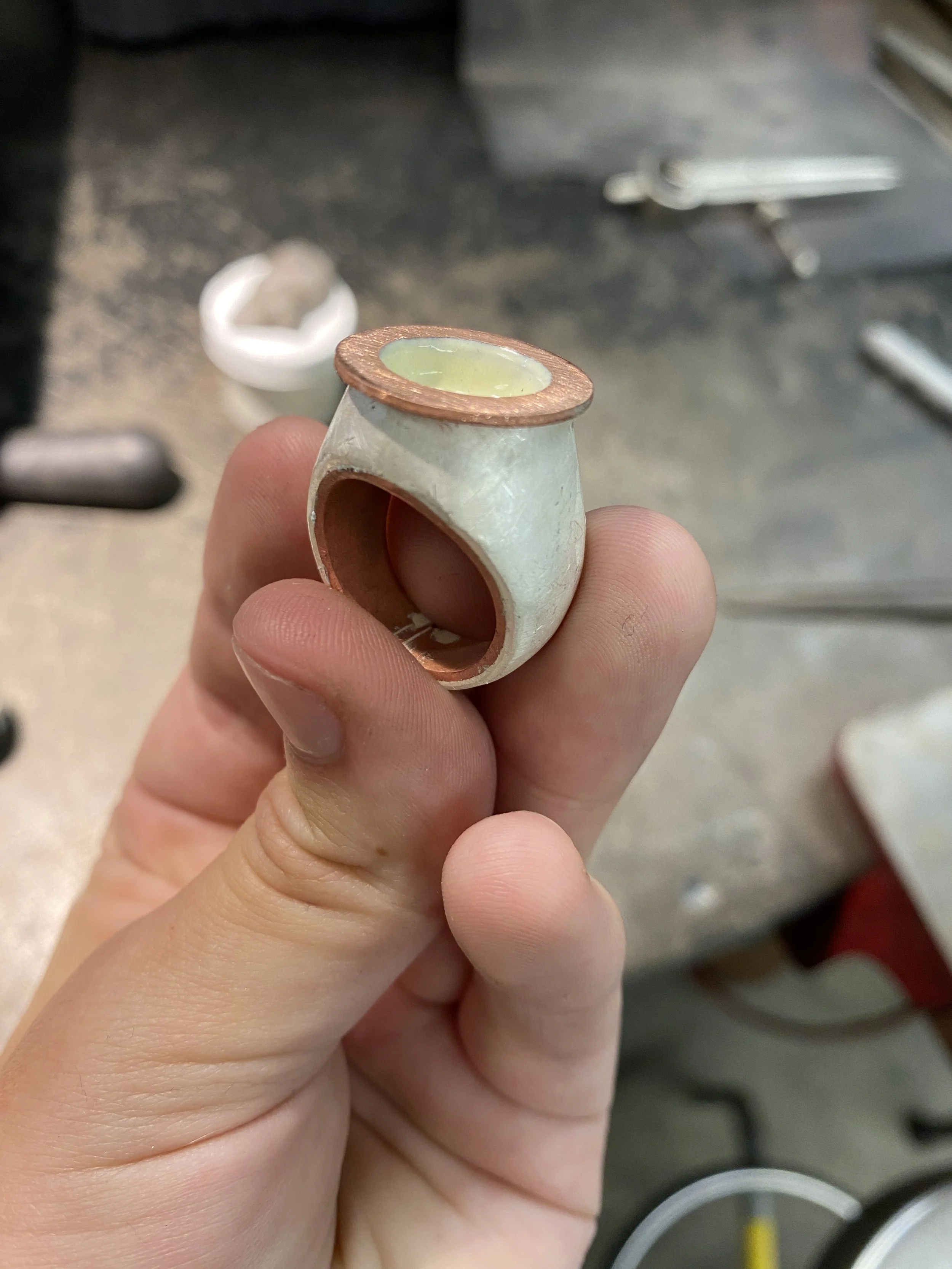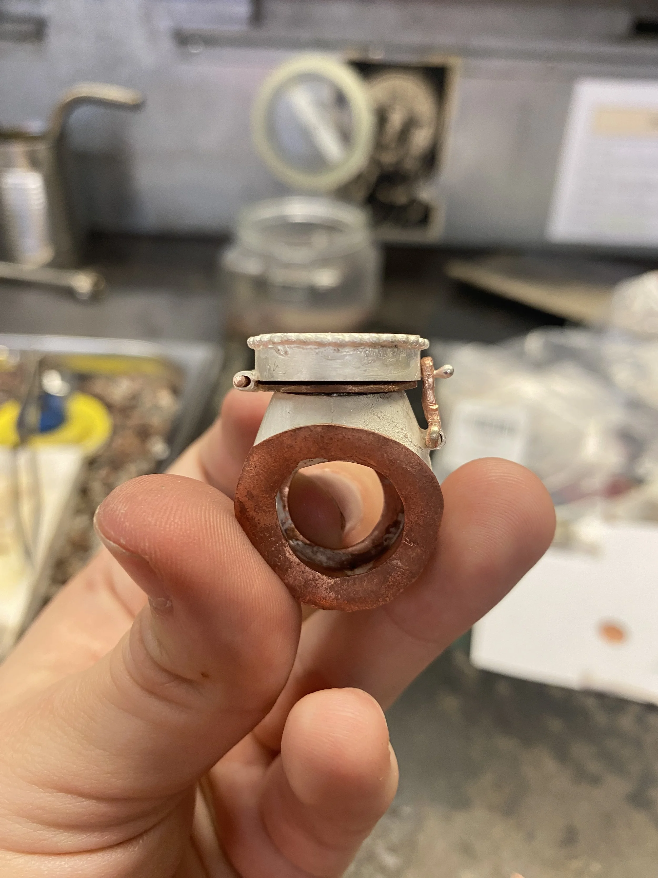 Checking to see if the inner chamber fit into the opening of the silver dogbone ring. It did, first try!
