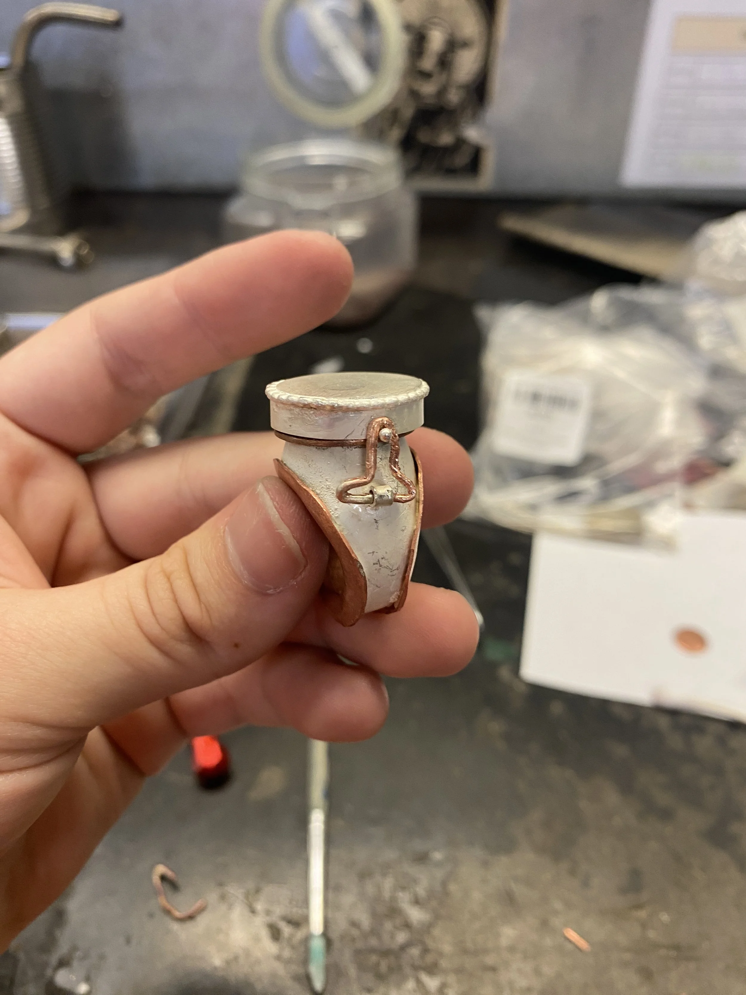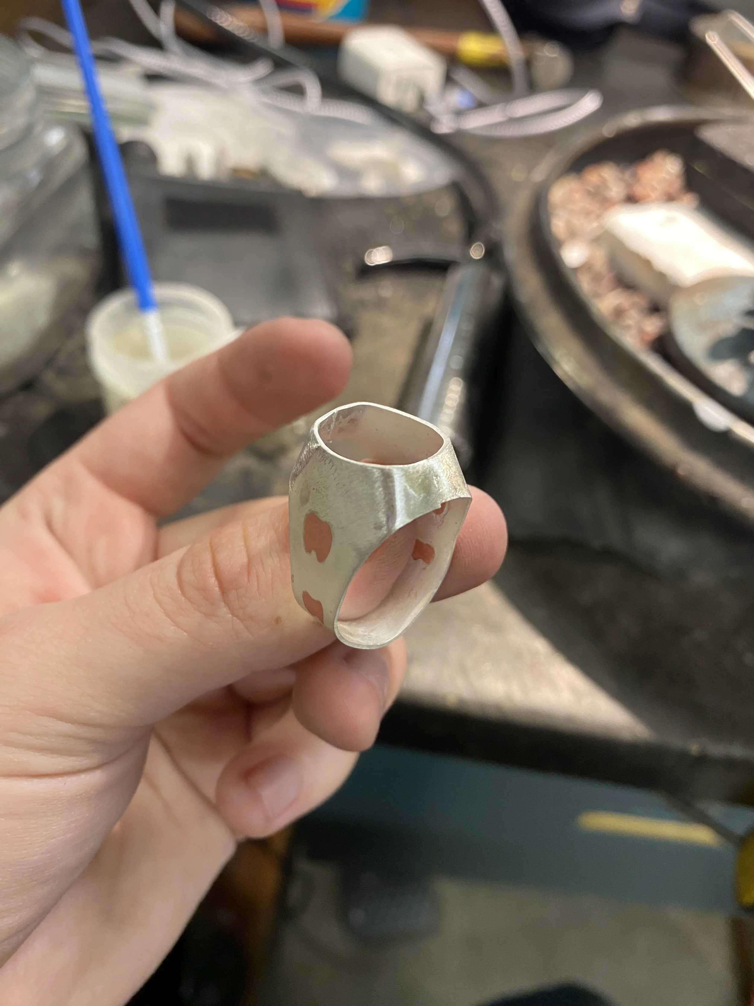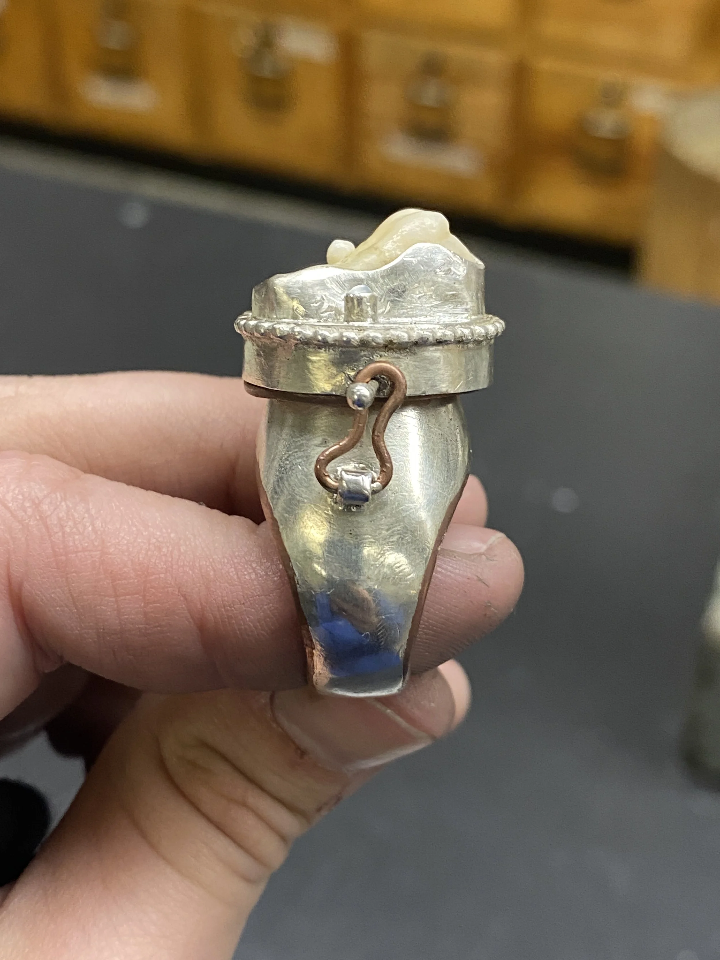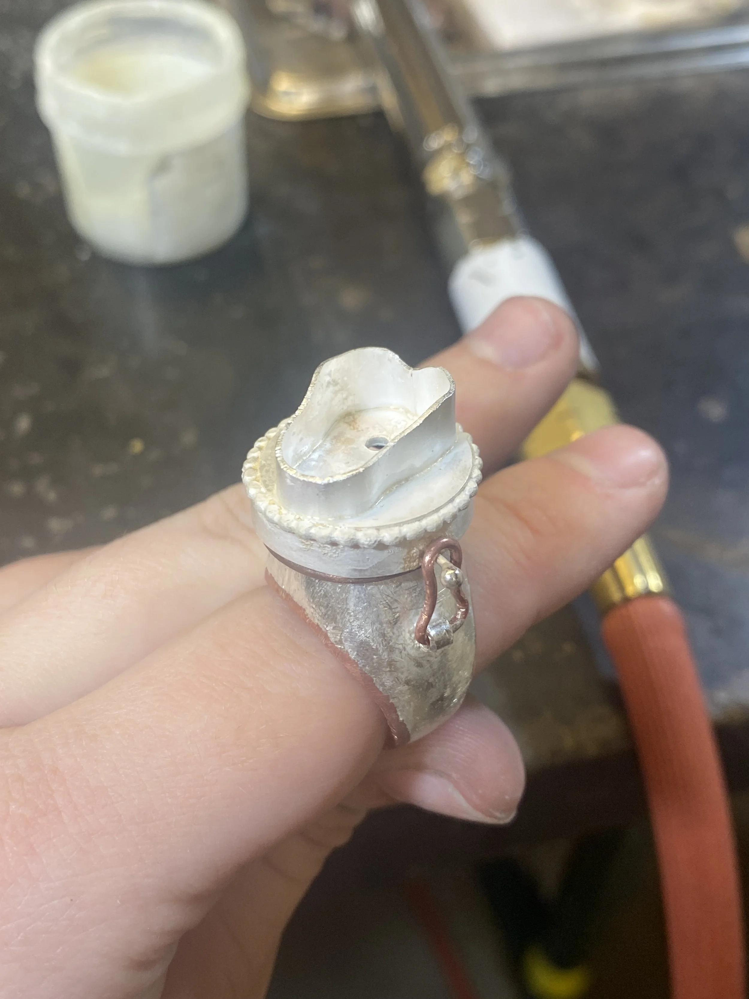 Initial design had 6 copper teeth inlayed into the silver. This failed and had to be recreated without the inlay. Very sad. Atlas was crying and had to leave the studio for the day.