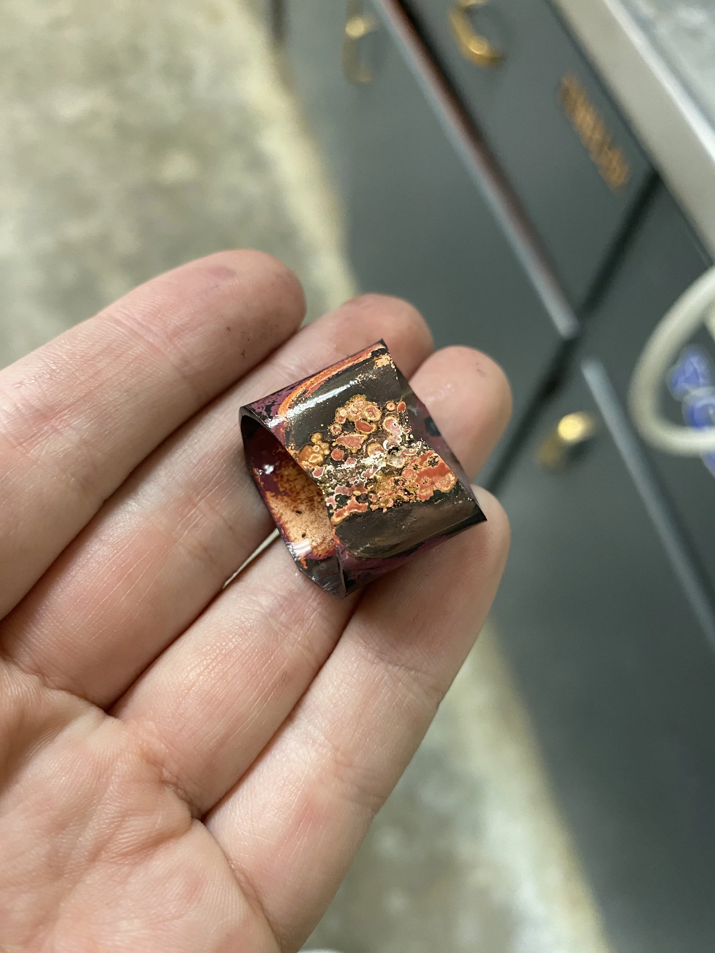 Originally assembled in Spring 2024 as a final project for Art 349 Fabrication Techniques at Cal Poly Humboldt, this ring was put on hold in its construction due to the shutdown of the university in response to nationwide protests. This ring was revisited in Spring 2025 for submission to the 2025 Battle of the Rings hosted by Danaca Design Gallery in Seattle, WA. It was accepted into the competition as a part of Team Shanks. As of April 7, it is available for purchase through the gallery, and on April 15, it was voted out during the first round of voting.