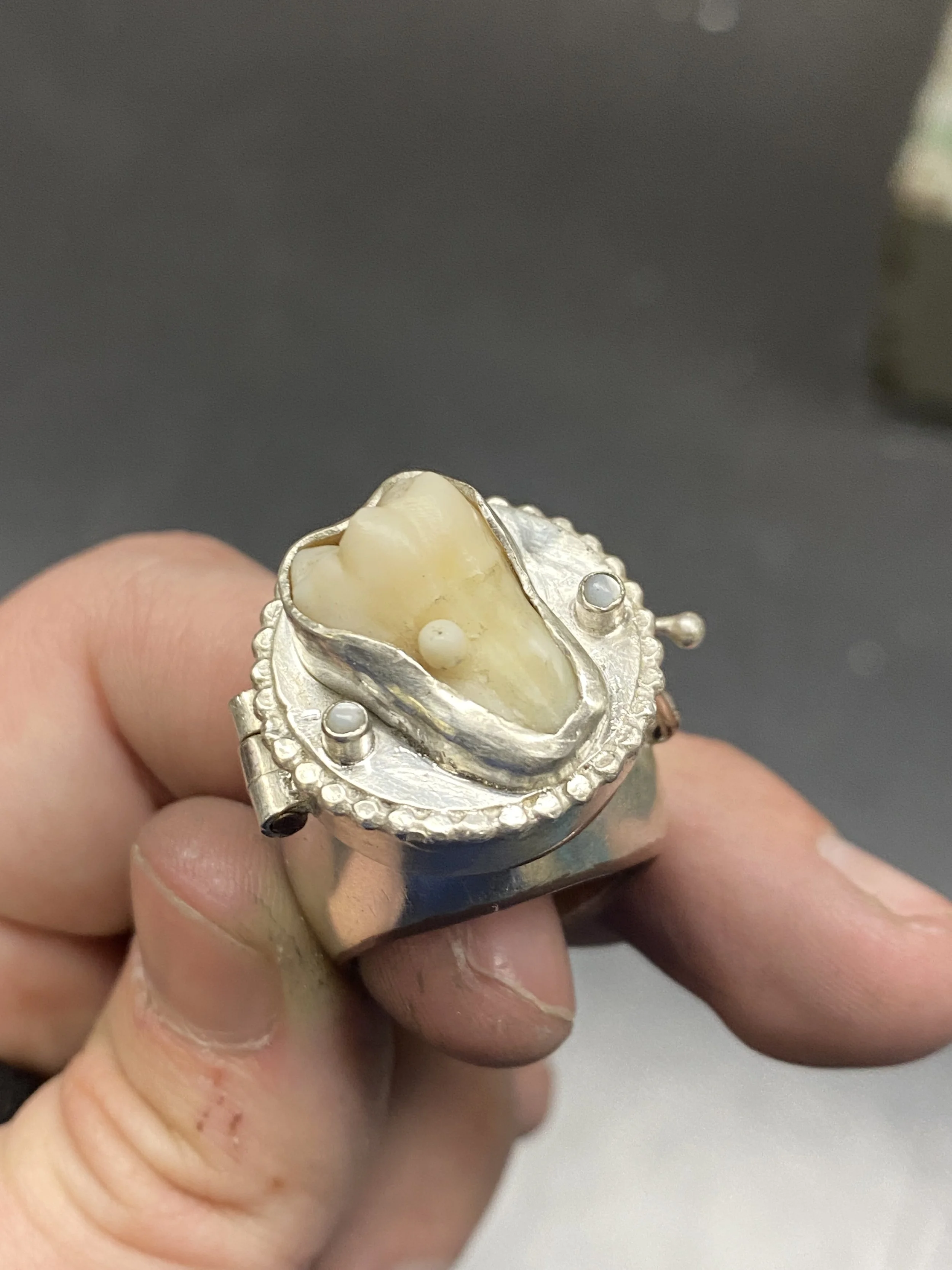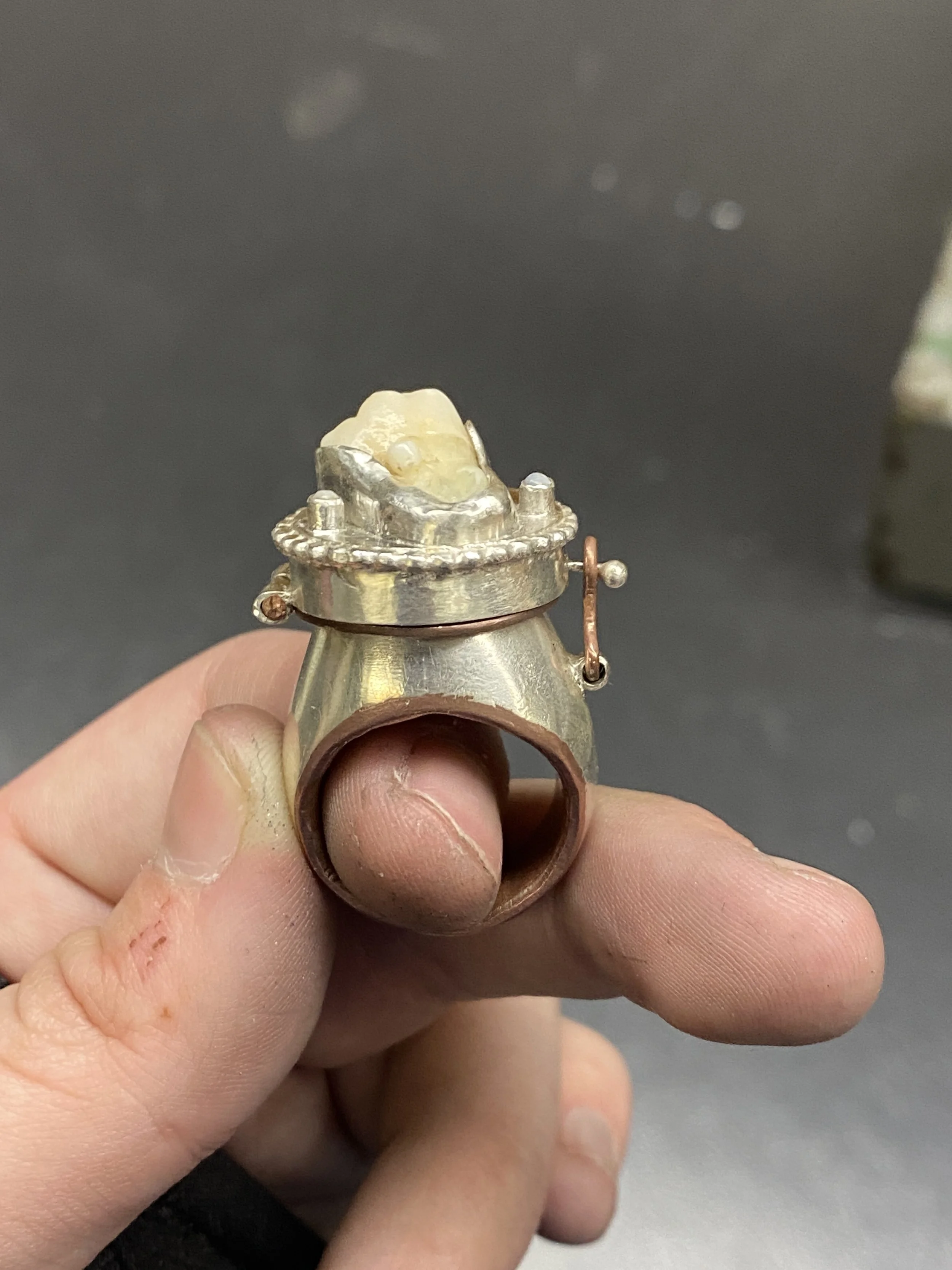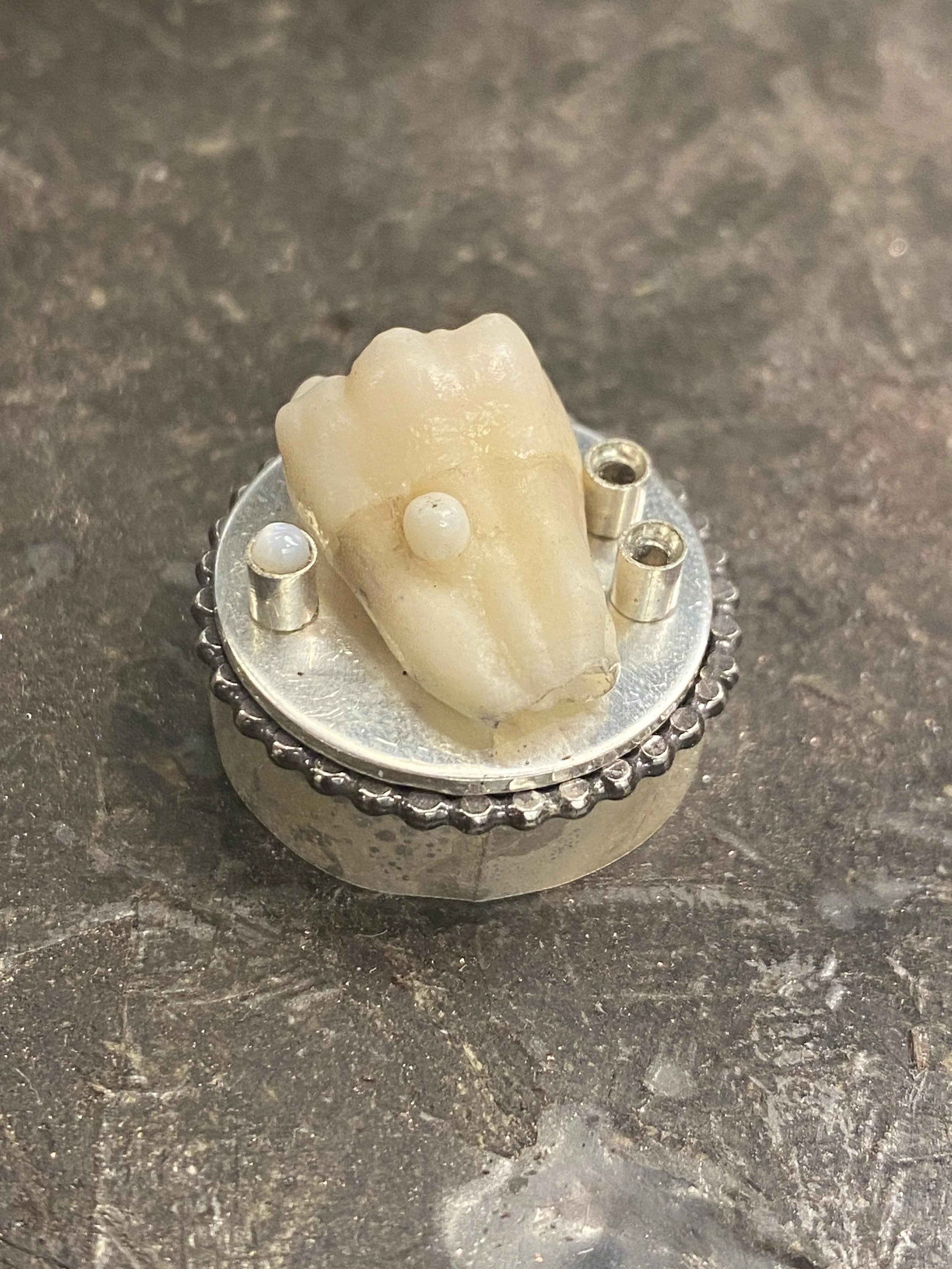 “A Sprinkle of Wisdom” is a traditional poison ring crafted from sterling silver and copper, featuring one of the artist’s wisdom teeth alongside two mother-of-pearls. Fit with an internal chamber colored to match the tooth, this ring is intended to be filled with sugar which can be sprinkled over food or drinks. The contrast between the human tooth and the sweetness of the sugar creates a striking tension—eerie and unsettling, yet captivating in its appearance and functionality.