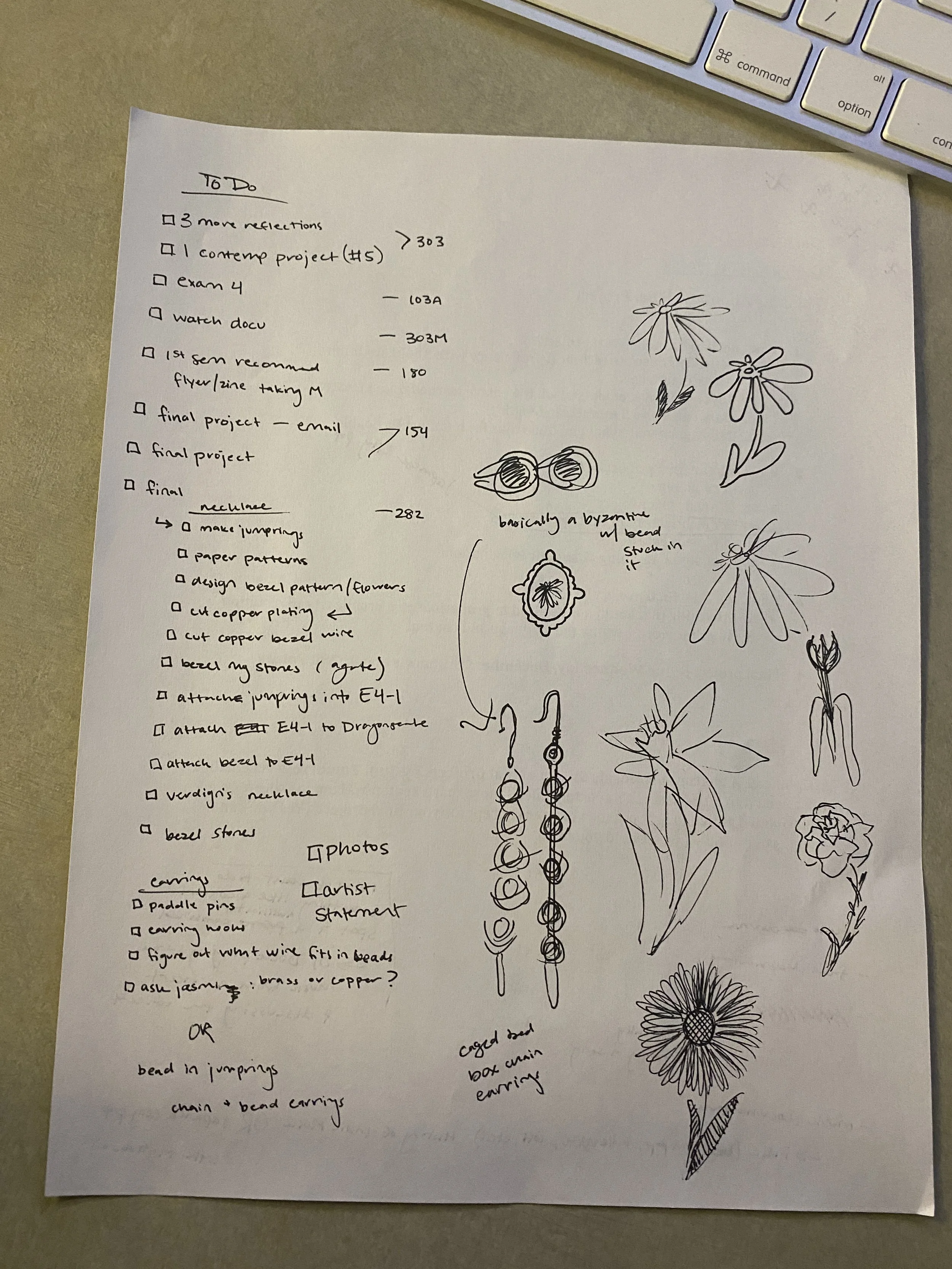 Final project to do list with flower sketches for potential piercework designs