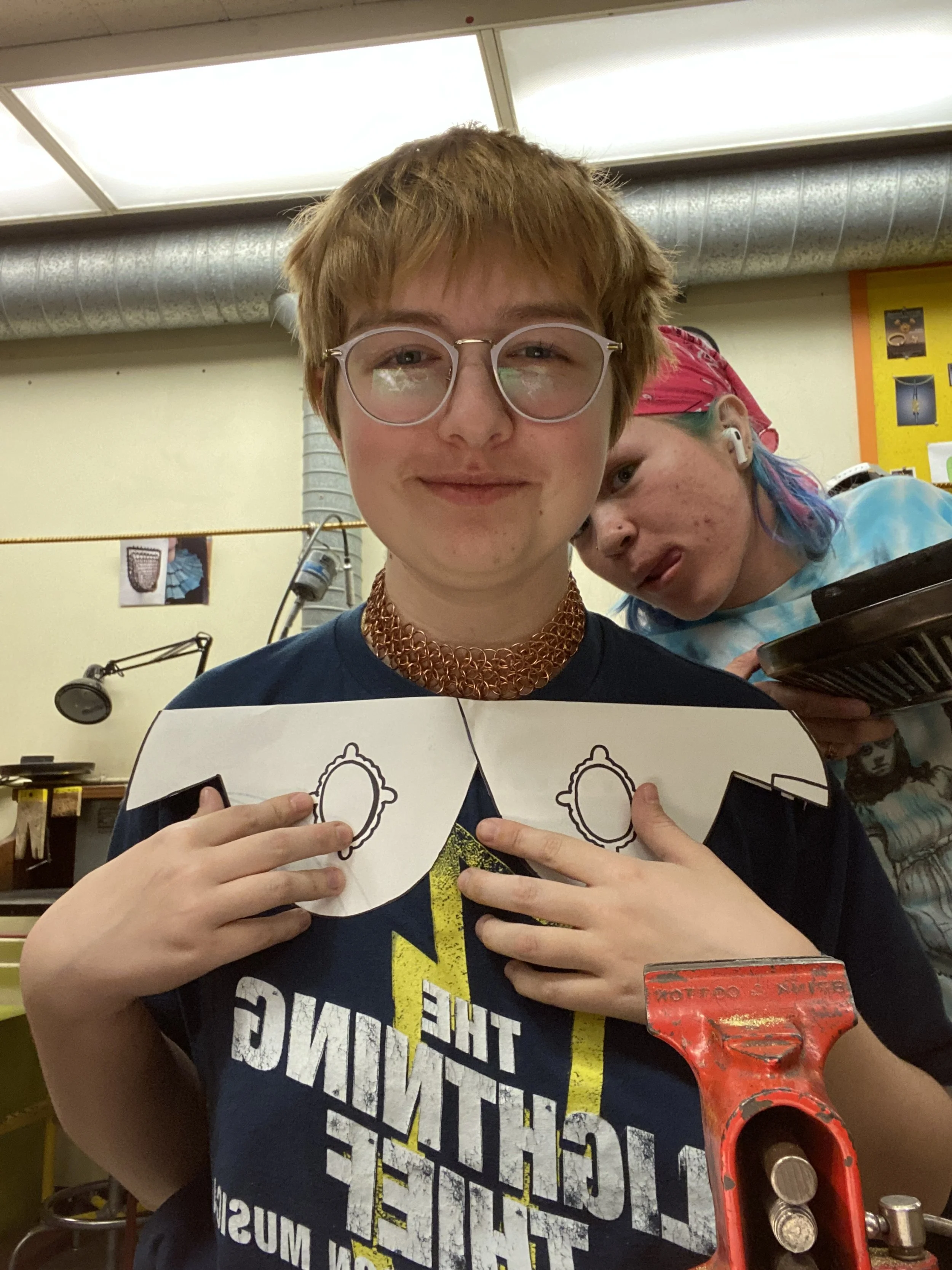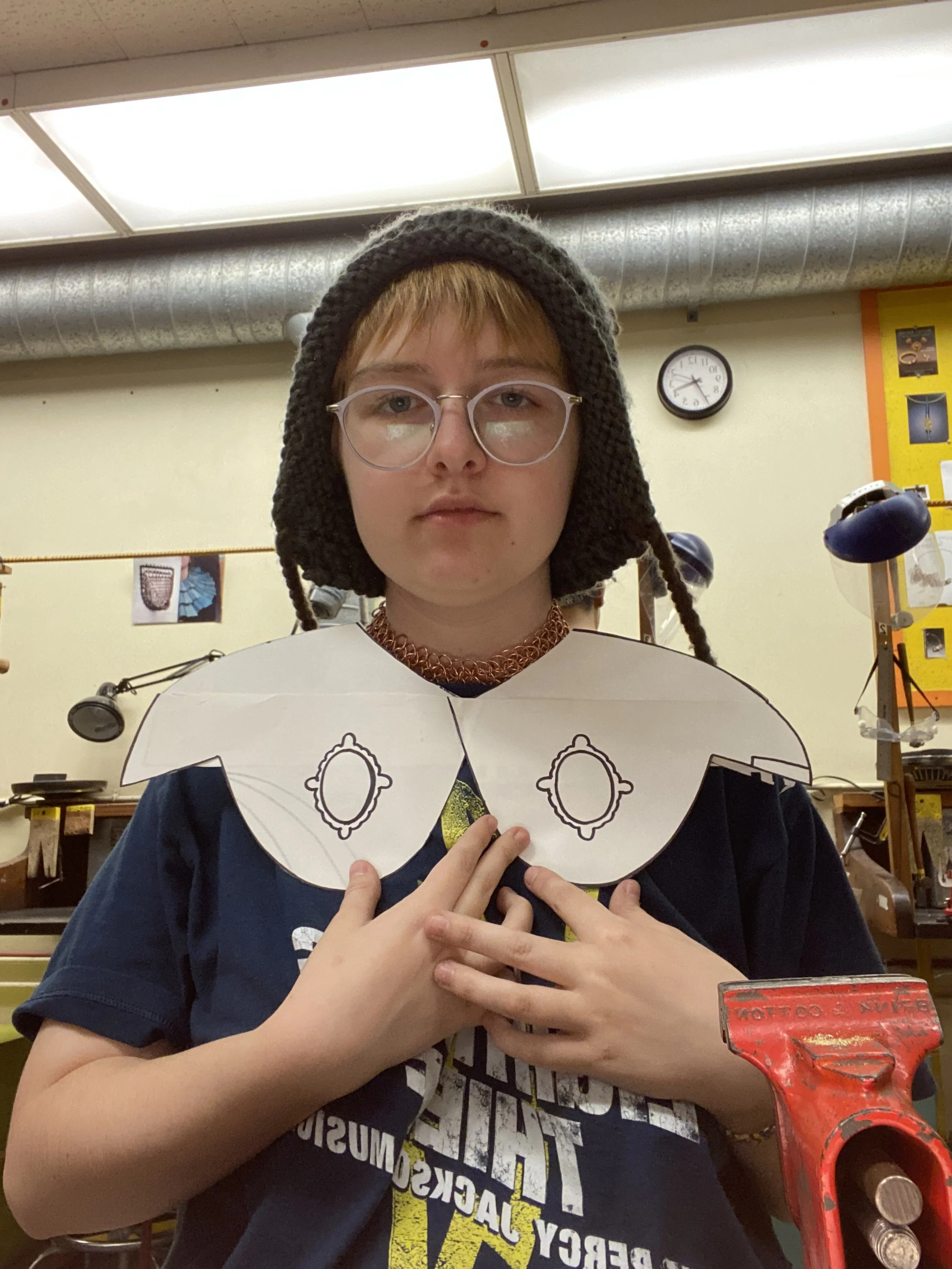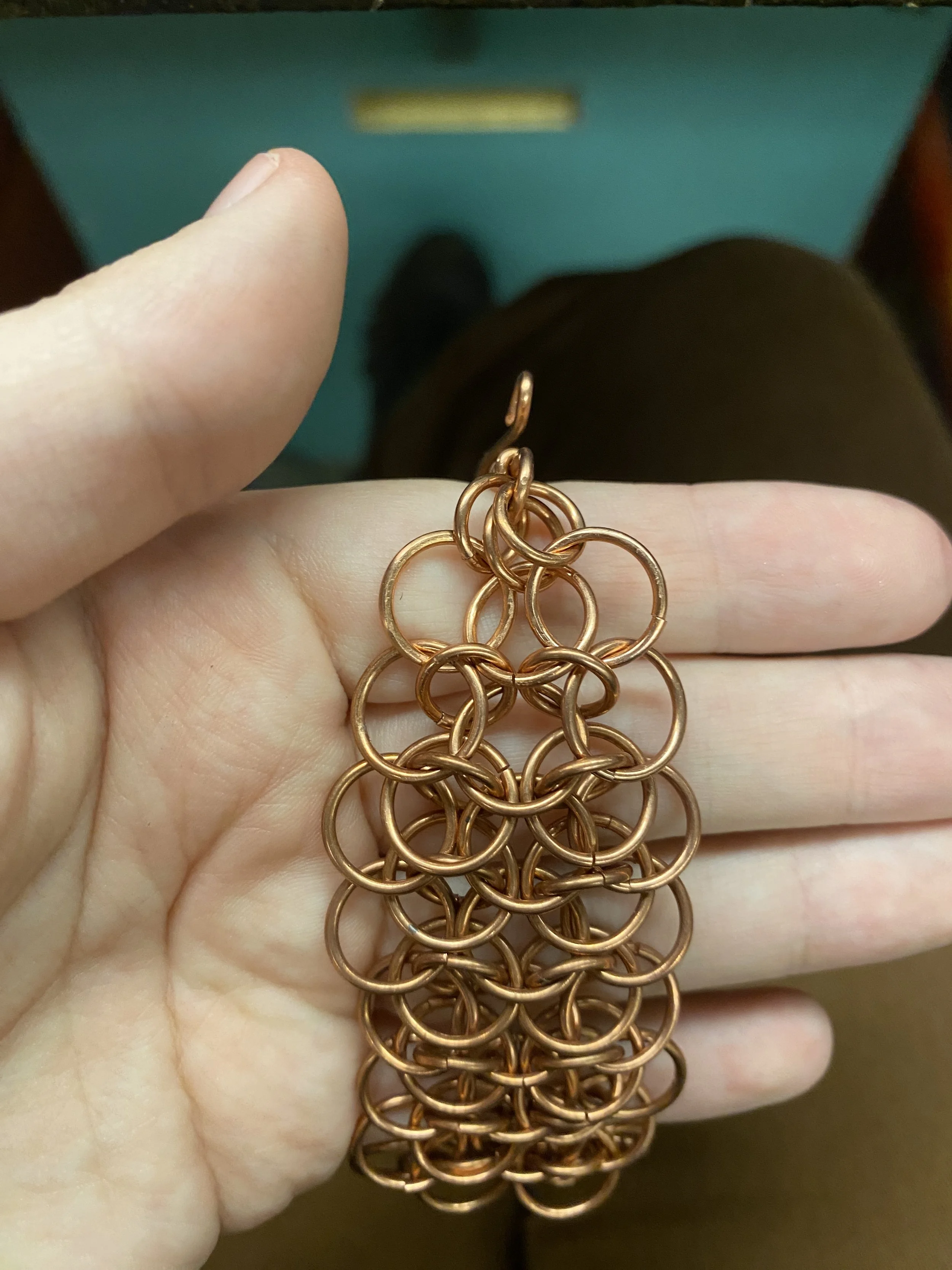 “Hold me close, hold me tight, please don’t ever let me go” is the intro jewelry class final created in December 2022. It was a project intended to challenge the artist in design, process, and assembly. Each jump ring was created by hand: coiled around metal mandrels, cut with a jeweler’s saw, and pried open and closed with pliers. It features stone setting, pierce works, and patination to complement the chainmaille.