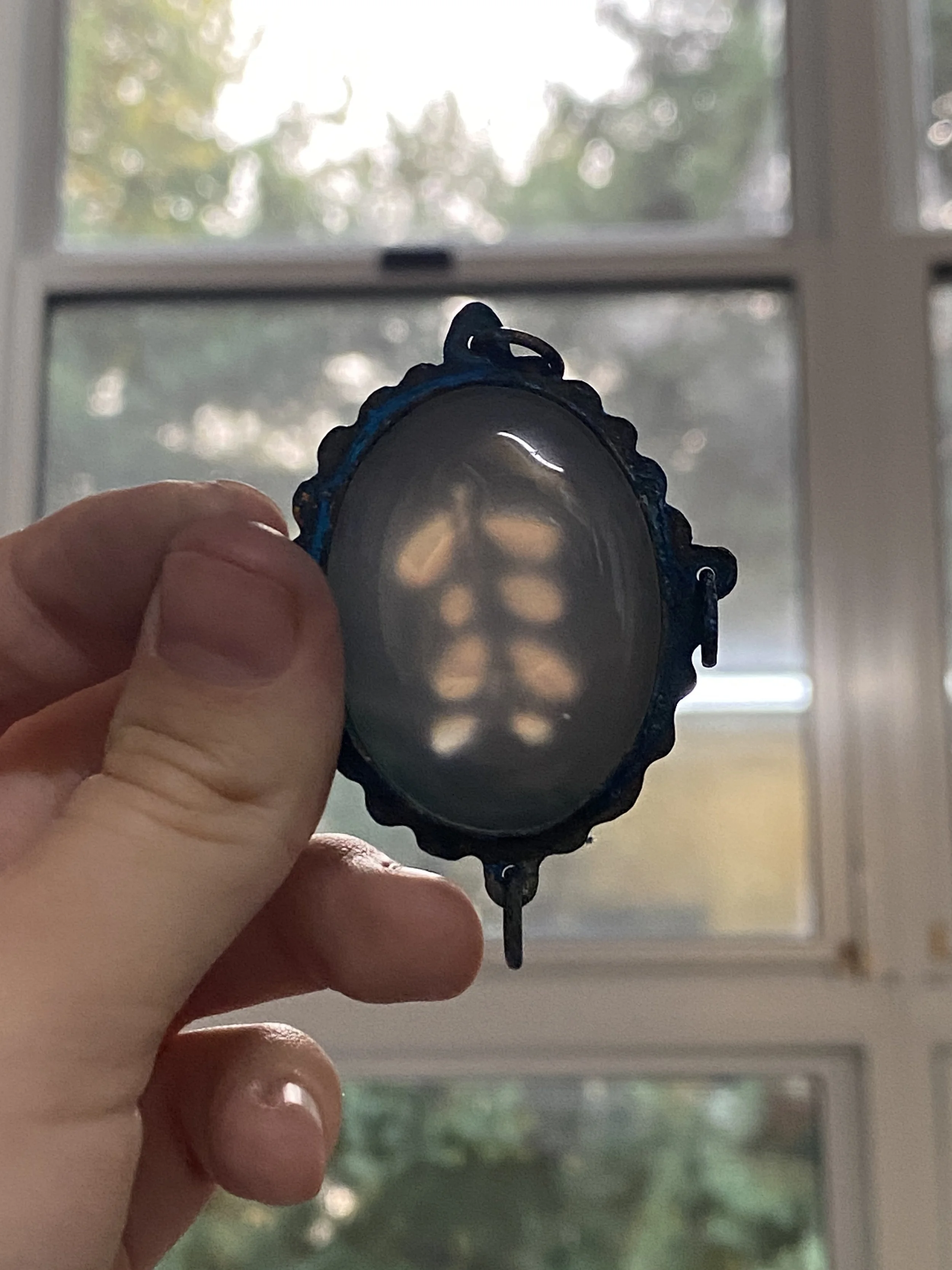 Piercework shining through the clear agate when held up to the light