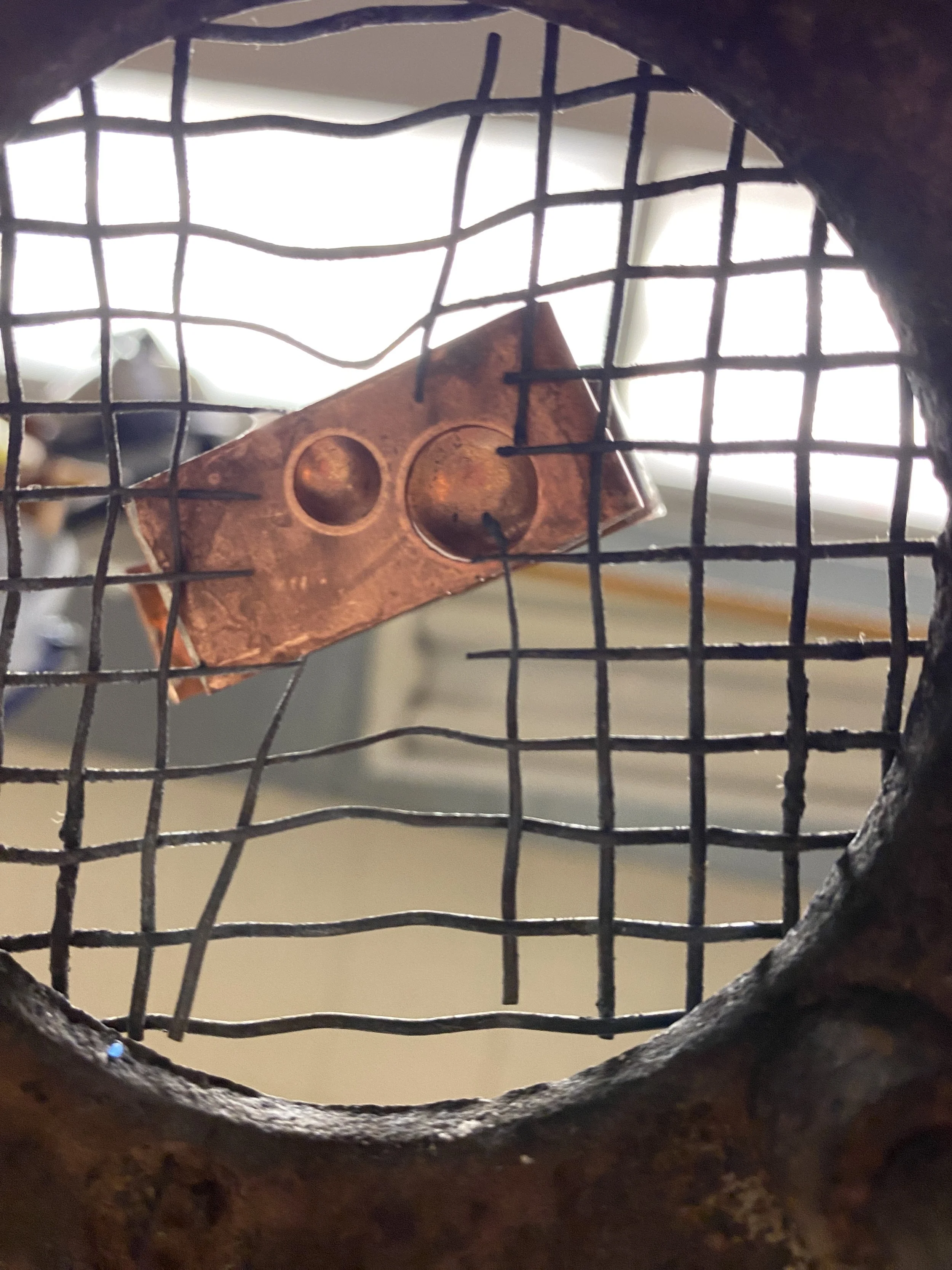 View of the inner part of the hollow ring. Seen is a drilled hole in the side-metal piece for a jeweler's saw to be threaded through and cut.