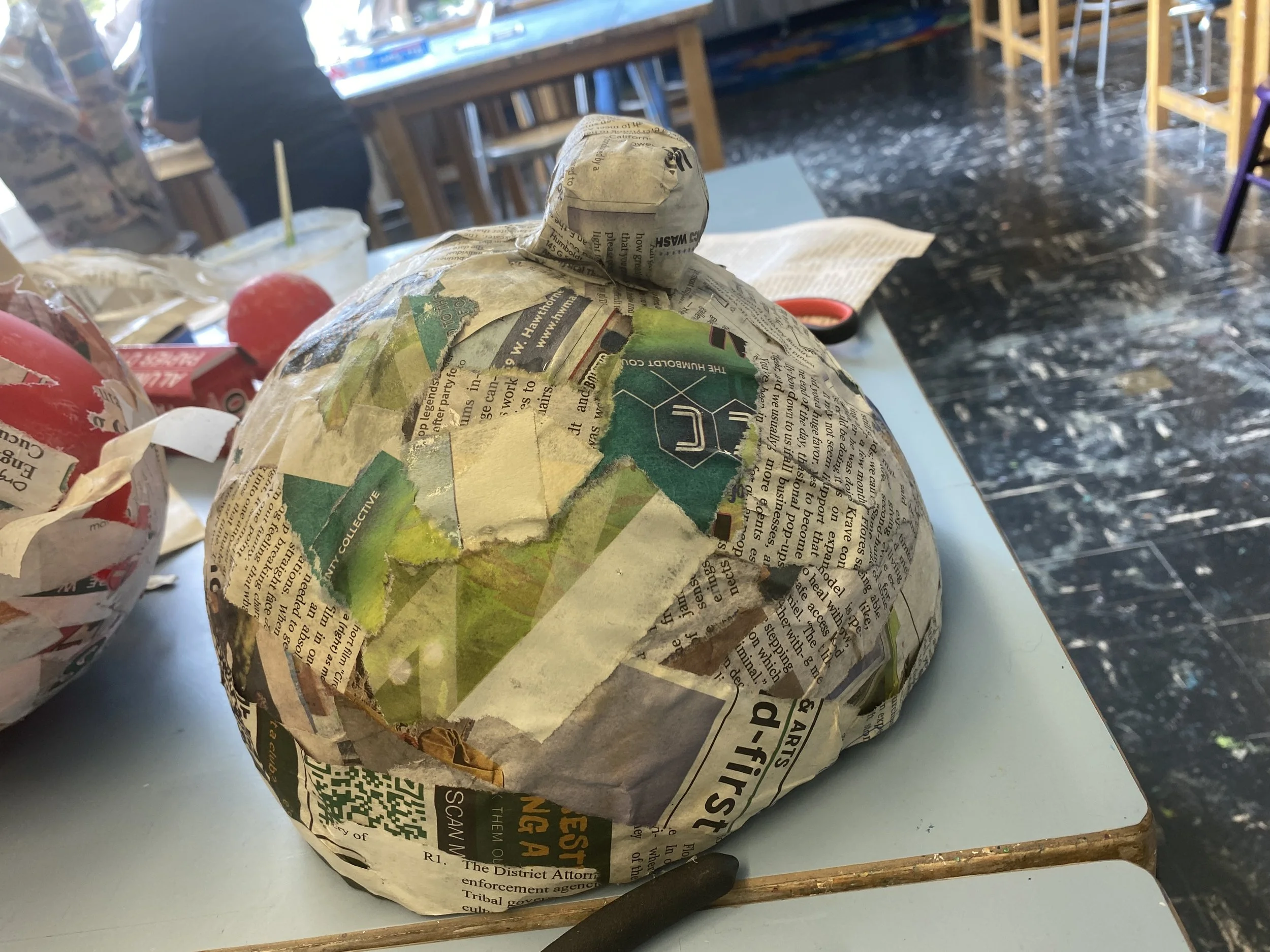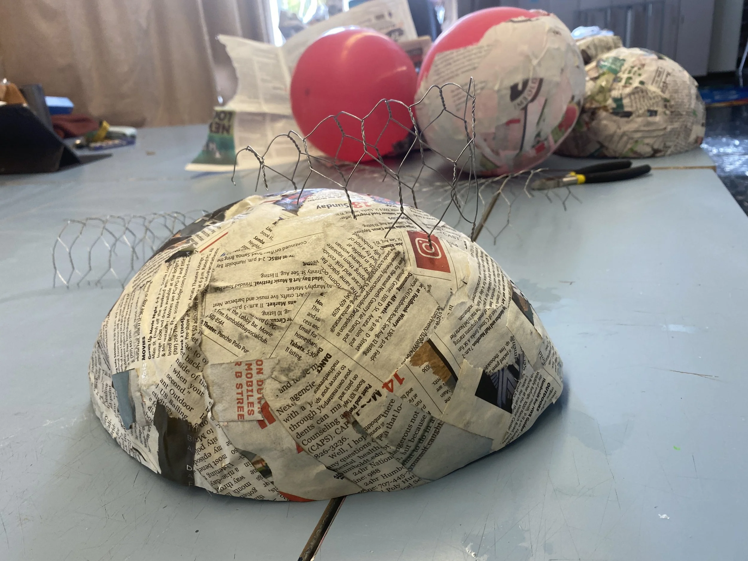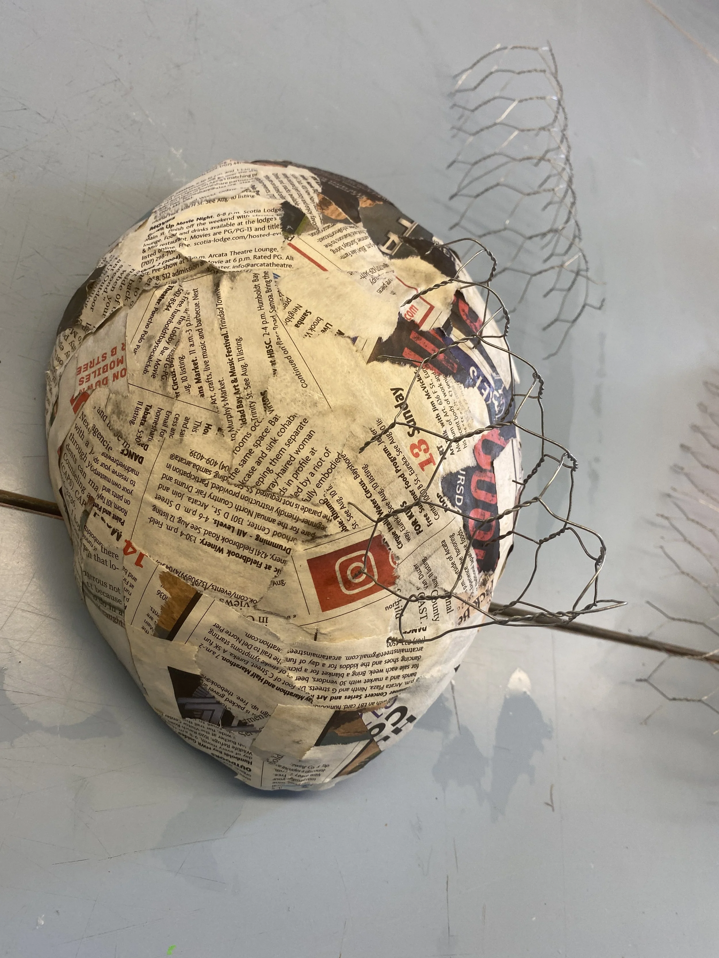 The Holy Trinity, papier mache, chicken wire, acrylic paint, gouache, 9.5 x 8.5 inches, 2023