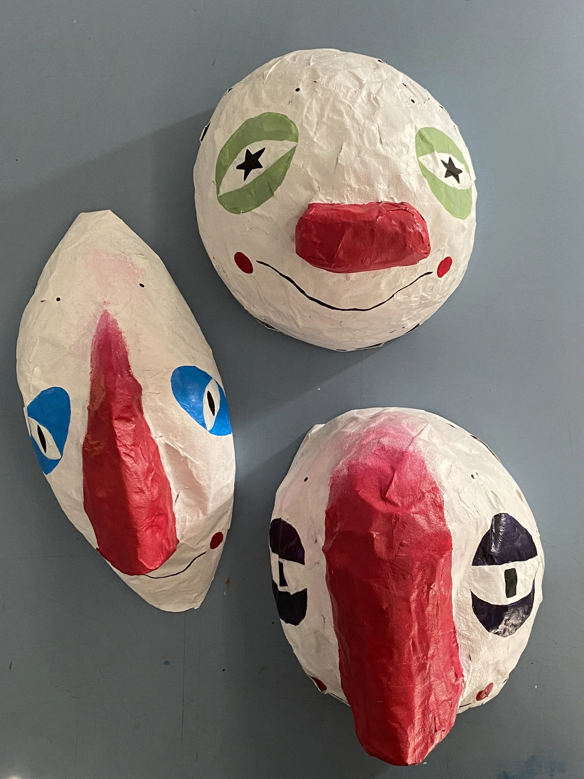 The Holy Trinity, papier mache, chicken wire, acrylic paint, gouache, 9.5 x 8.5 inches (top, green), 13.5 x 6 inches (left, blue), 10.5 x 8 inches (bottom, purple), 2023