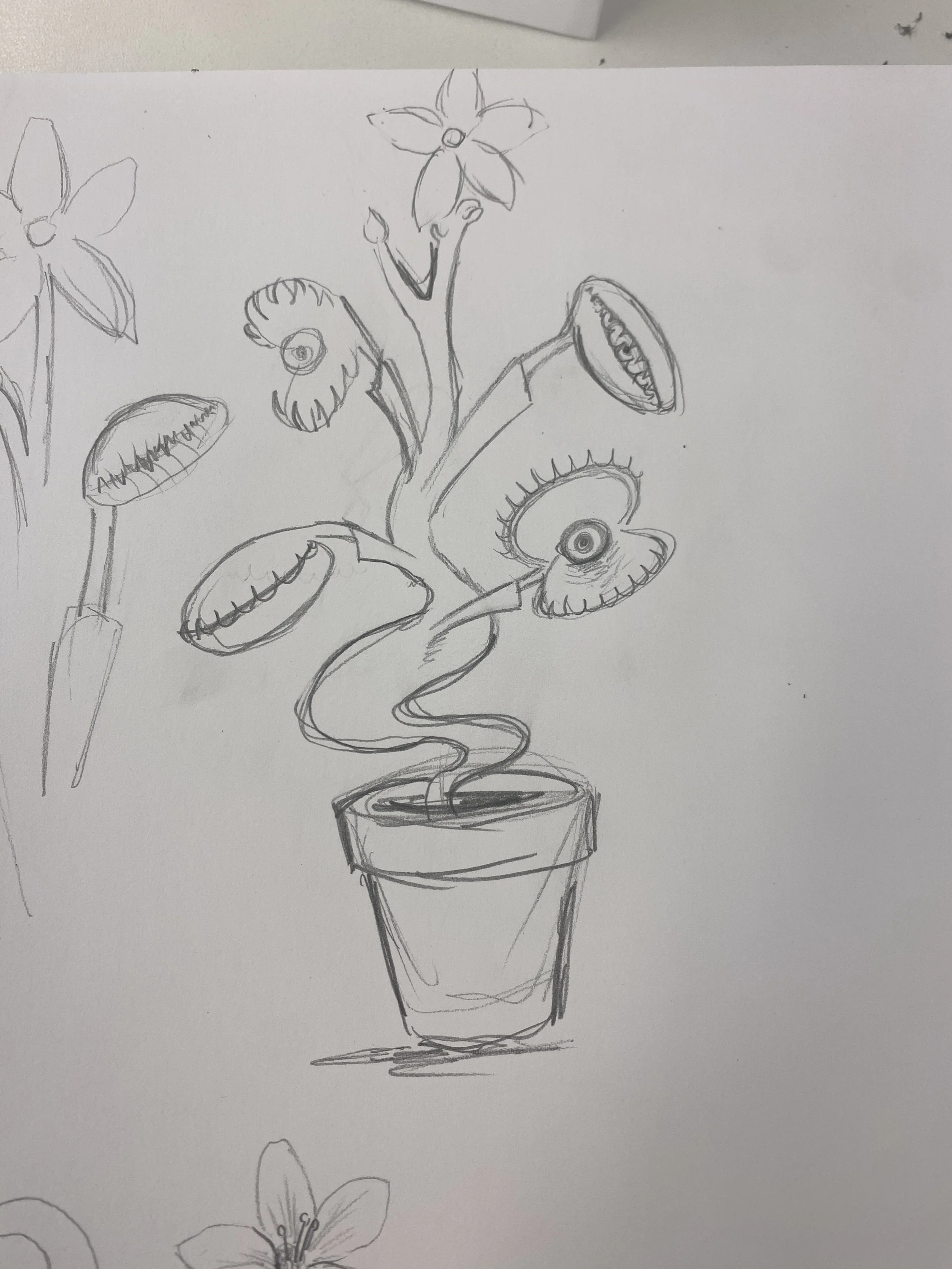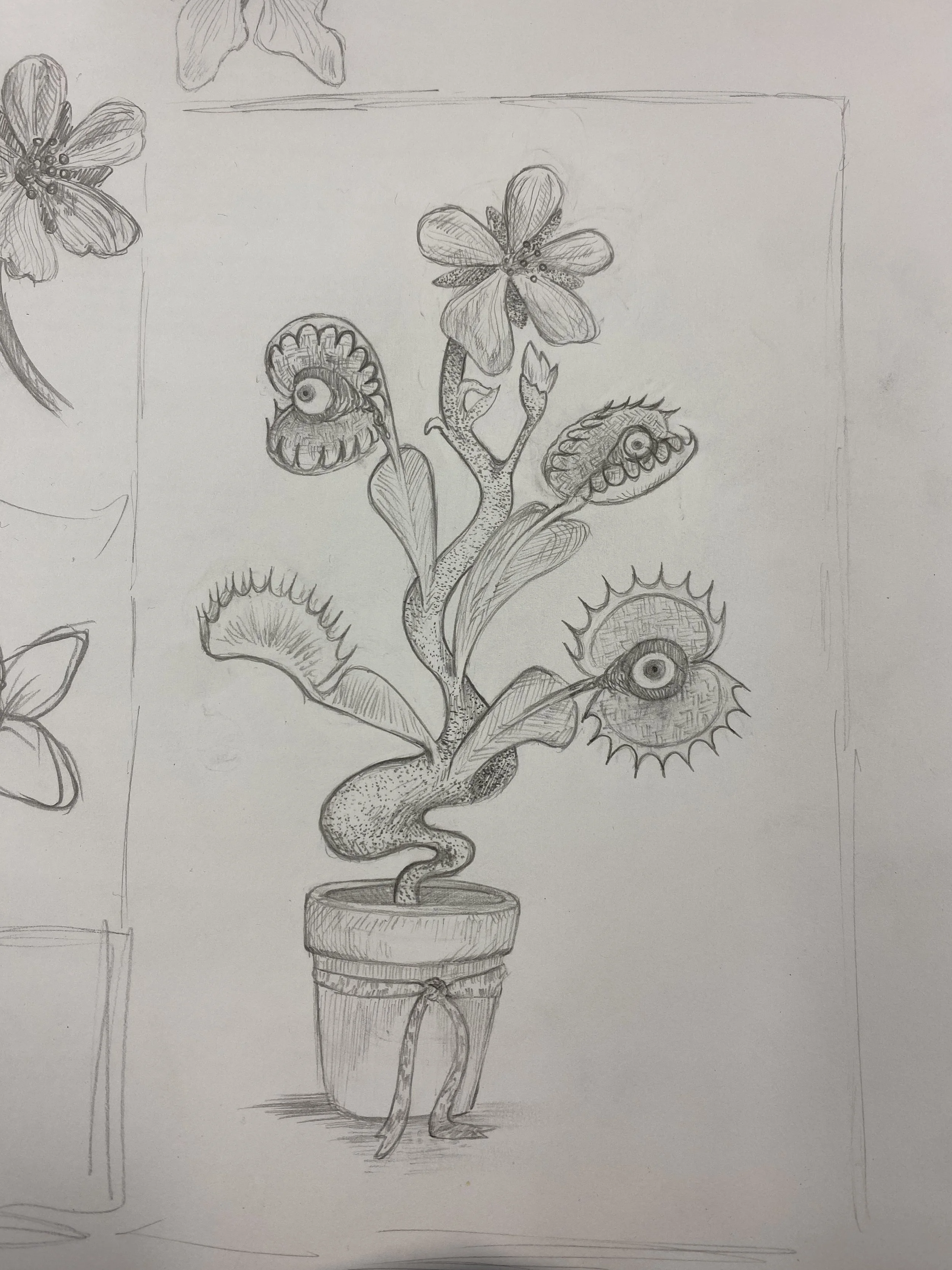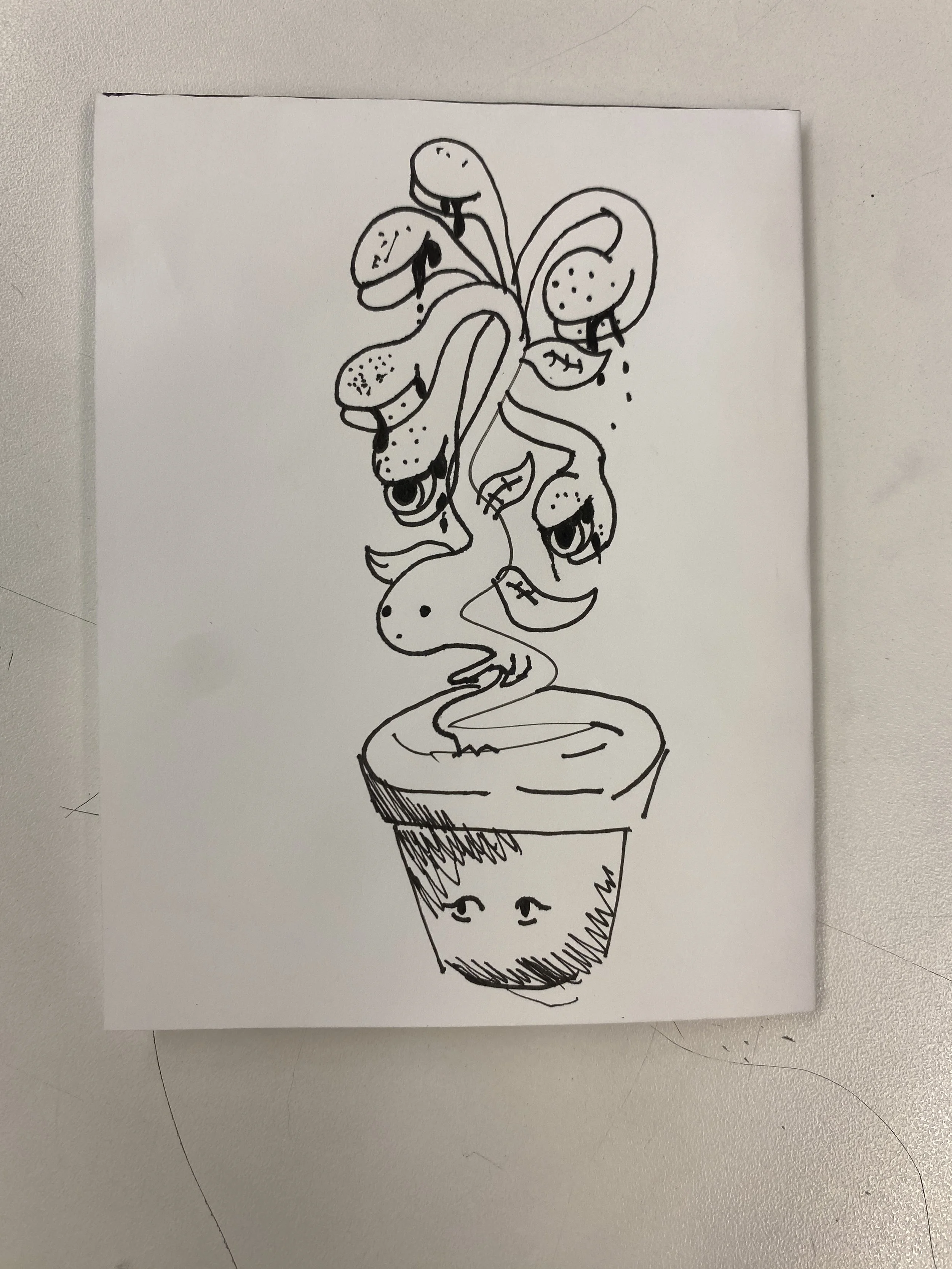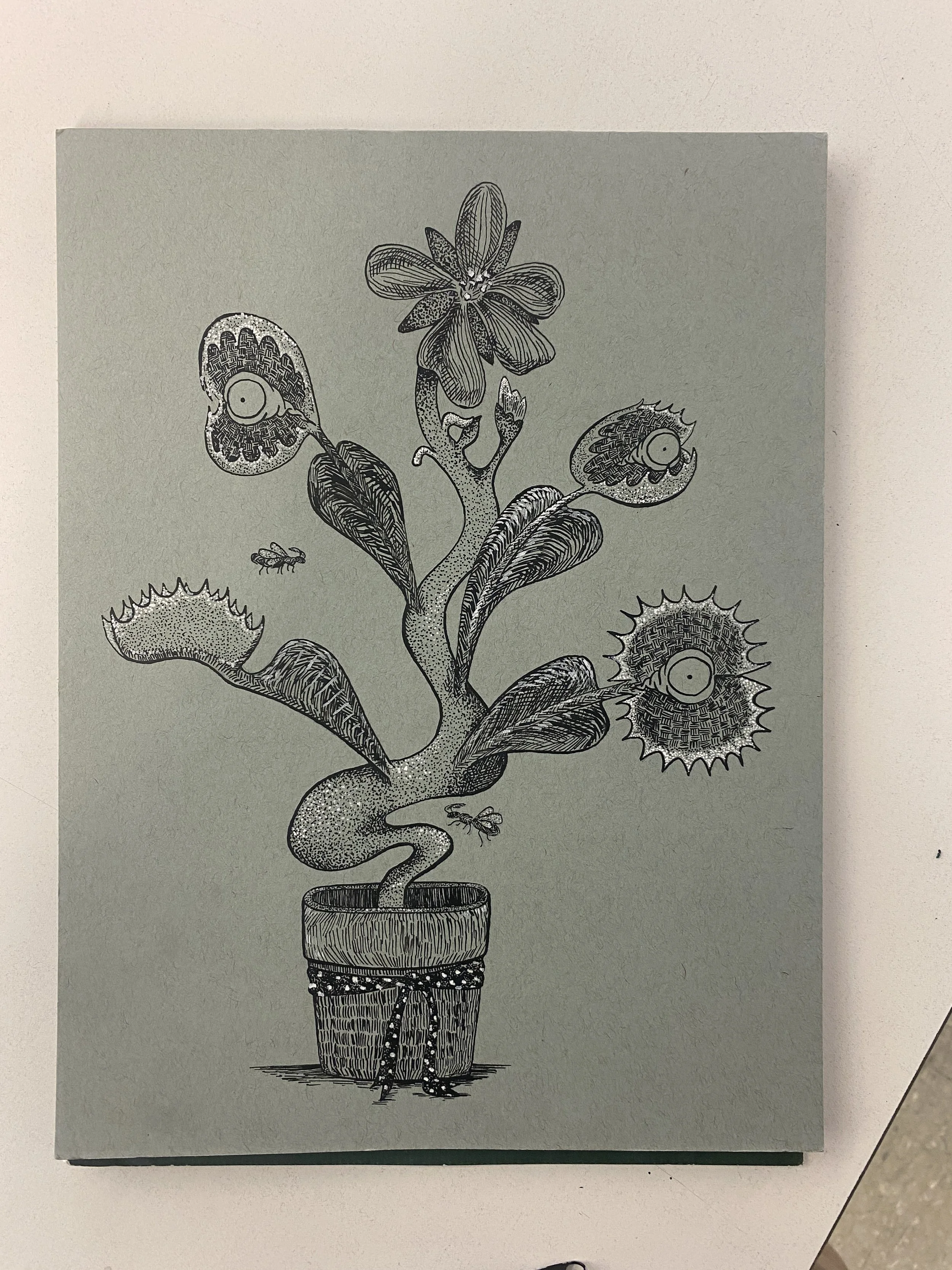 “Watch Out, It’ll Bite” is a black-and-white India Ink and Acrylic Ink illustration using a dip pen. It was an intro project for Art 273 at Cal Poly Humboldt for the Fall 2023 semester. The project started as a class exercise of Lynda Barry’s Scribble Monster Jam drawing exercise. From this, a selected drawing was chosen to be recreated using traditional materials. Illustrated is a venus flytrap monster with eyes embedded in its traps, planted in a cute terracotta pot.