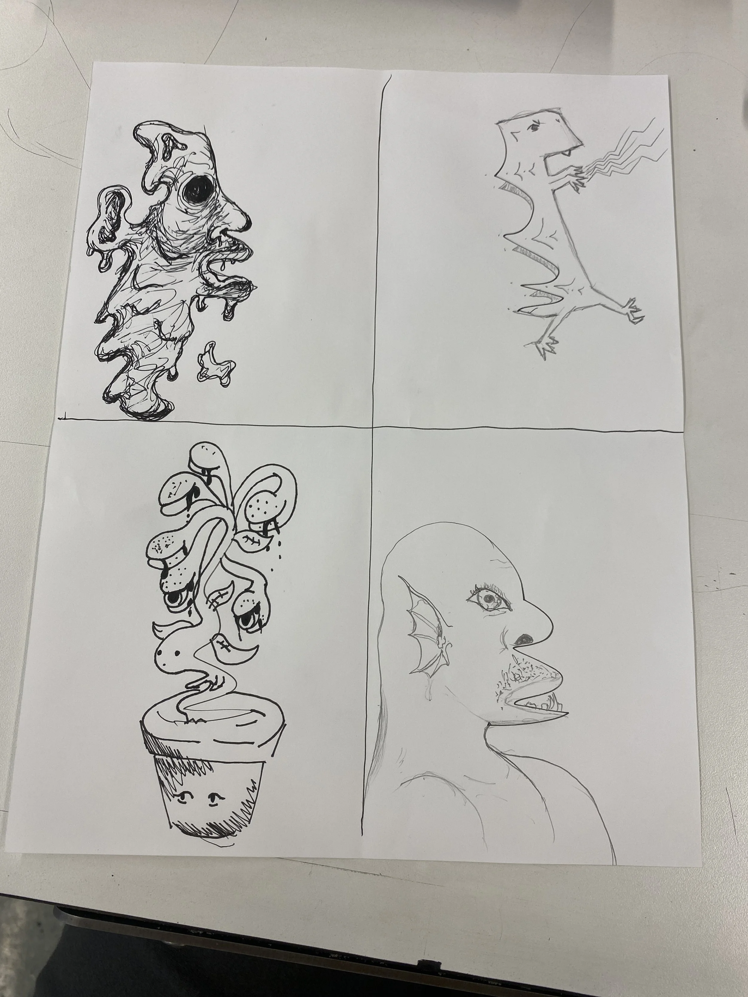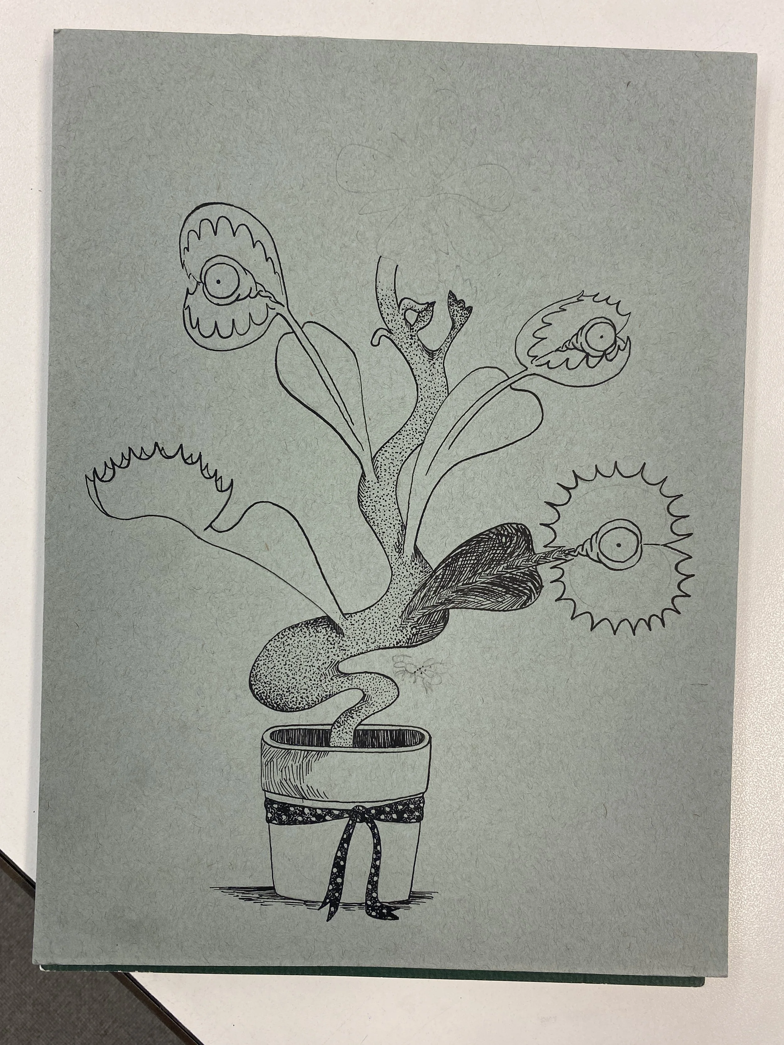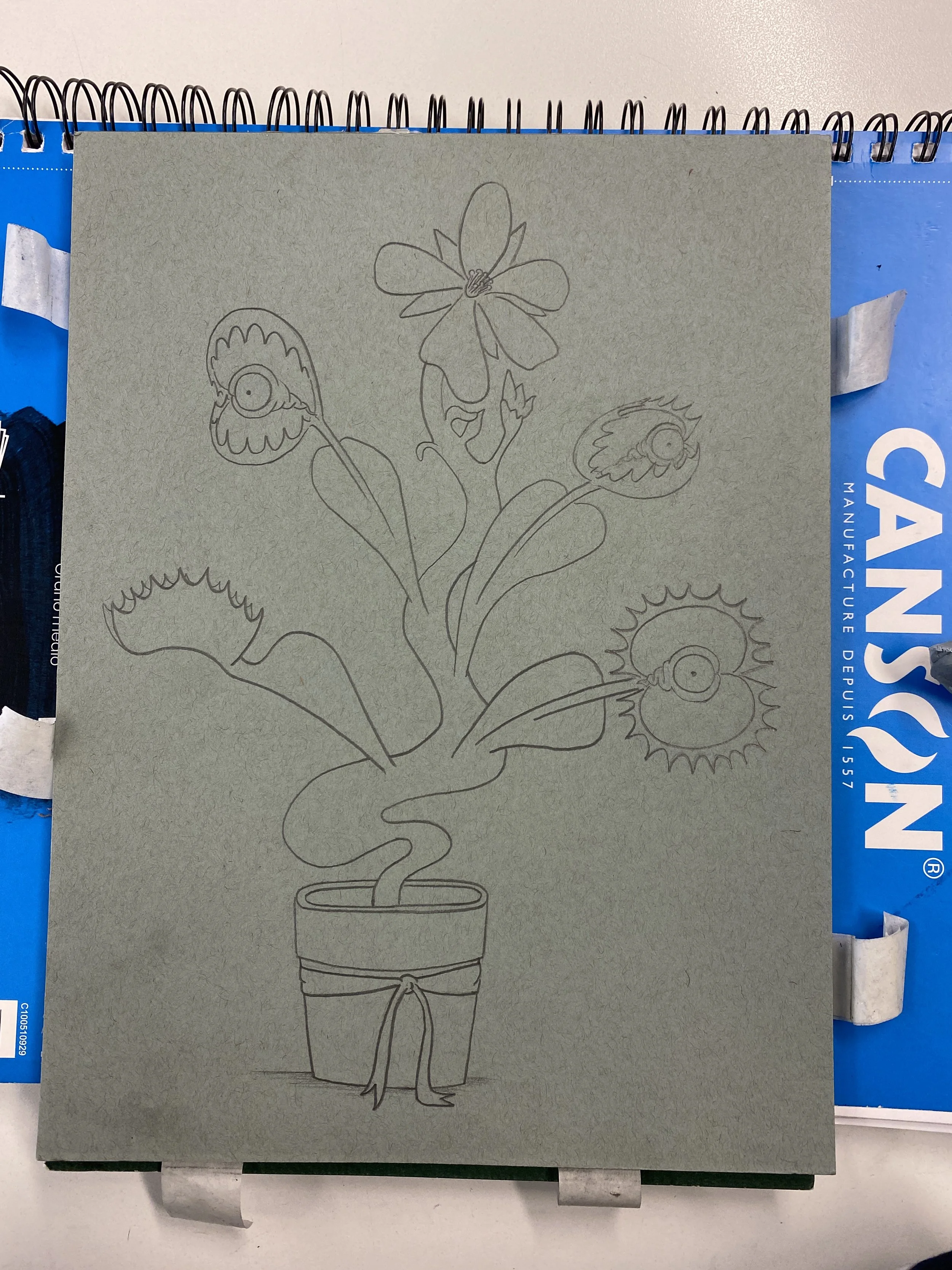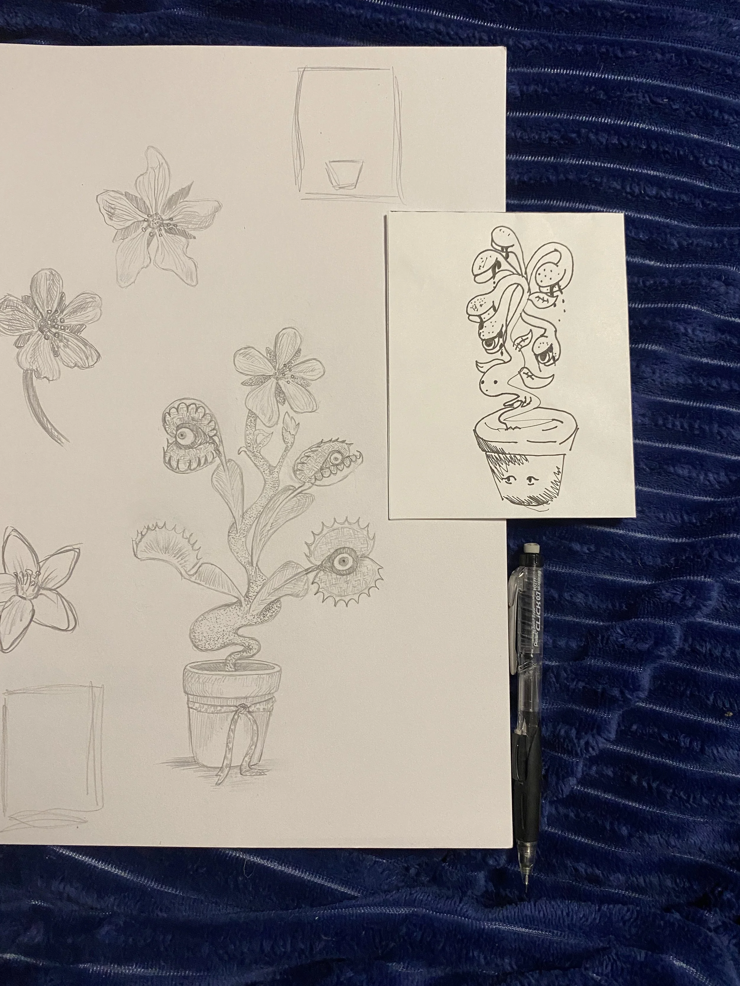 “Watch Out, It’ll Bite” is a black-and-white India Ink and Acrylic Ink illustration using a dip pen. It was an intro project for Art 273 at Cal Poly Humboldt for the Fall 2023 semester. The project started as a class exercise of Lynda Barry’s Scribble Monster Jam drawing exercise. From this, a selected drawing was chosen to be recreated using traditional materials. Illustrated is a venus flytrap monster with eyes embedded in its traps, planted in a cute terracotta pot.